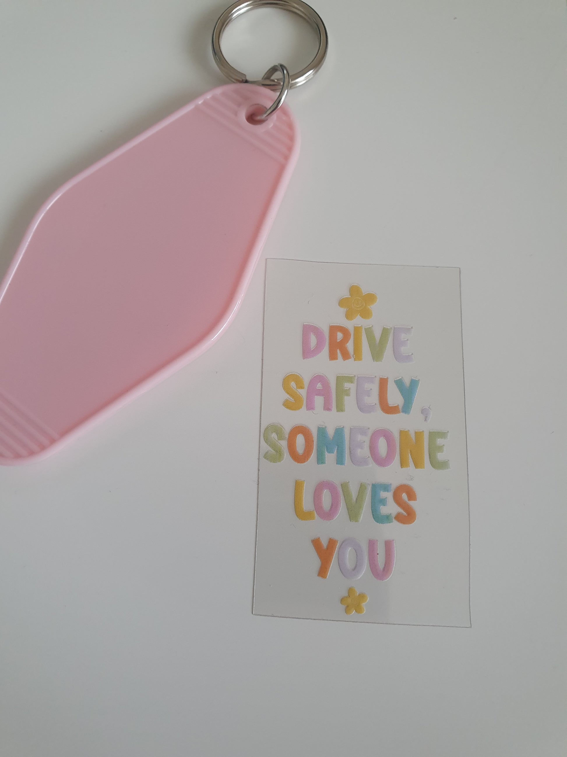 Drive Safely Motel Keyring UV DTF print